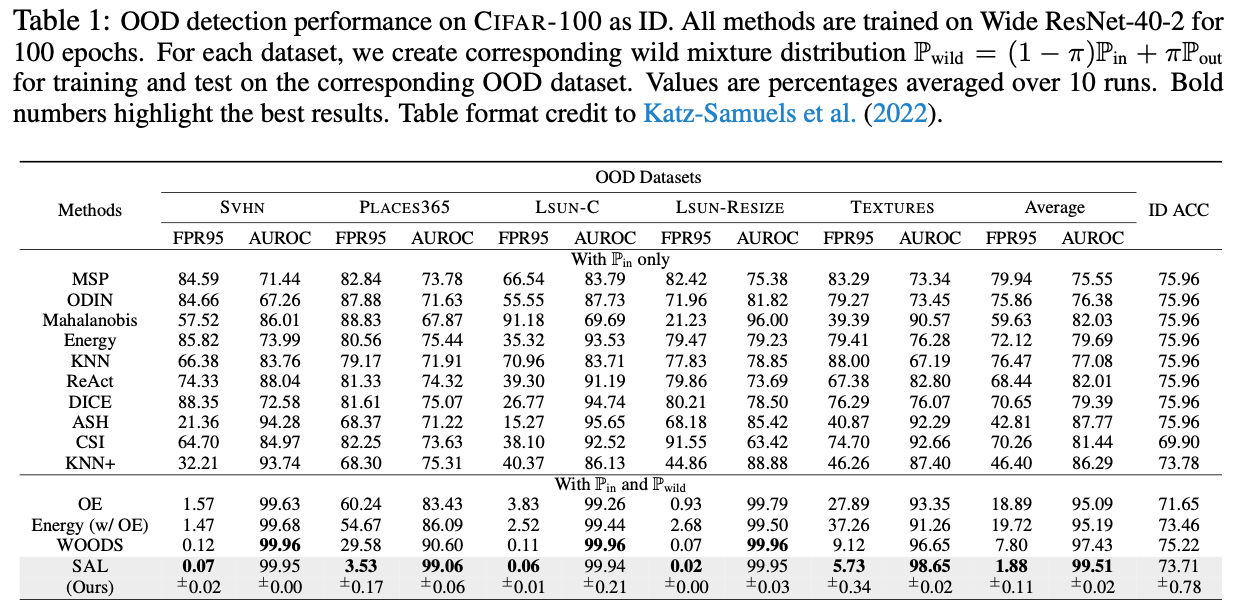 - 이론적으로 SAL은 wild 환경에서 outlier의 separability와 OOD classifier의 learnability를 분석함으로써, unlabeled wild data가 OOD detection에 어떻게 기여할 수 있는지에 대한 질문에 답한다.