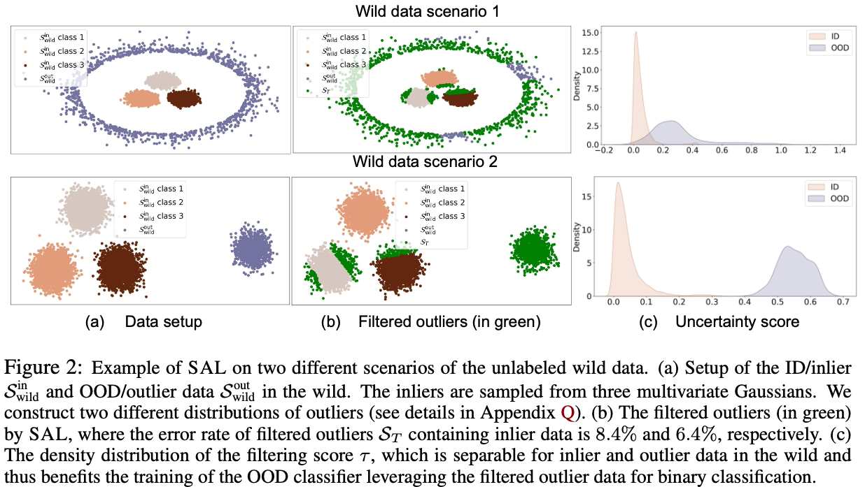 - wild data는 ID data(3 class gaussian)와 OOD data의 혼합으로 구성된다. 두 가지의 시나리오를 고려하였고, ground truth는 보라색이다.